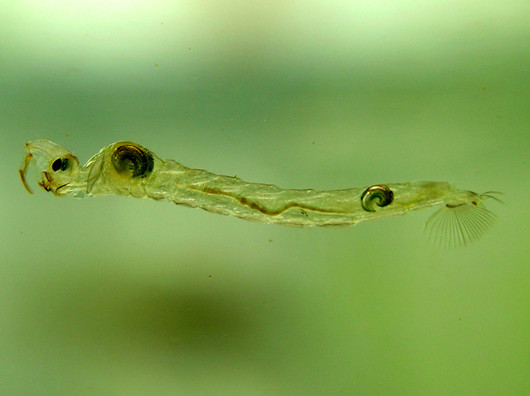 Ciało larwy wydłużone, przeźroczyste z wyraźnie widocznymi ciemnymi pęcherzami hydrostatycznymi. Na końcu odwłoka wachlarzyk.